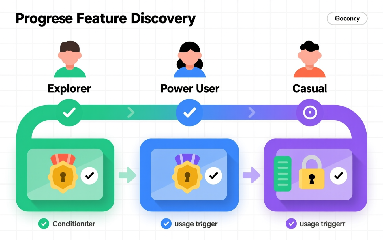 Definição: progressive disclosure é a prática de mostrar funcionalidades conforme o usuário progride, evitando sobrecarga inicial. Dados de adoção de produto apontam que tours guiados e experiências contextualizadas aumentam descoberta de recursos em ~47% por reduzir o ruído e focar em tarefas relevantes. Empresas como Canva aplicam onboarding progressivo para reduzir fricção em novos usuários, apresentando funcionalidades avançadas só quando necessárias.